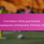 Ο σχηματισμός I χαρακτηρίζεται από δύο running backs που είναι τοποθετημένοι ακριβώς πίσω από τον quarterback, σχηματίζοντας μια ευθεία γραμμή ή "I". Αυτή η διάταξη επιτρέπει μια ισορροπημένη επίθεση, διευκολύνοντας τόσο τις τρέχουσες όσο και τις πάσες. Ο σχηματισμός I είναι ιδιαίτερα αποτελεσματικός για παιχνίδια δύναμης, καθώς παρέχει ισχυρή υποστήριξη μπλοκαρίσματος.